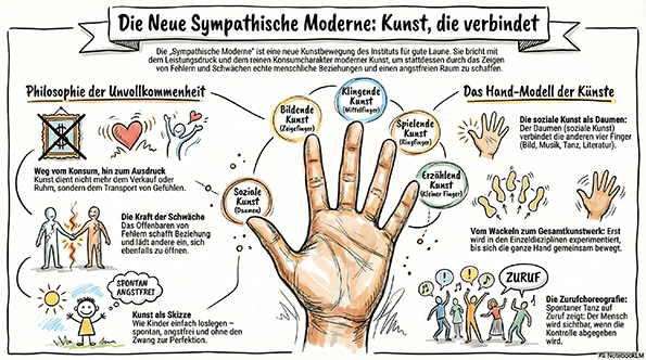 Die neue sympathische Moderne ist eine vom Institut für gute Laune entwickelte Kunstform, die sich als Gegenentwurf zur heutigen, konsumorientierten Kunst versteht. Während moderne Kunst oft darauf ausgerichtet ist, berühmt zu werden oder Geld zu verdienen, lehnt die Sympathische Moderne diesen kommerziellen Fokus ab.