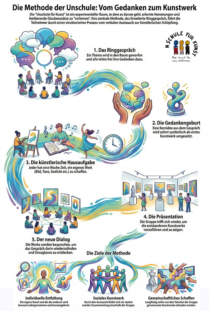 - 3. Besuche unsere Ringgespräche und bringe die dort erarbeiteten Gedanken mit deiner Kunst (Malerei, Poesie, Tanz, Geschichte u.s.w.) zur Welt